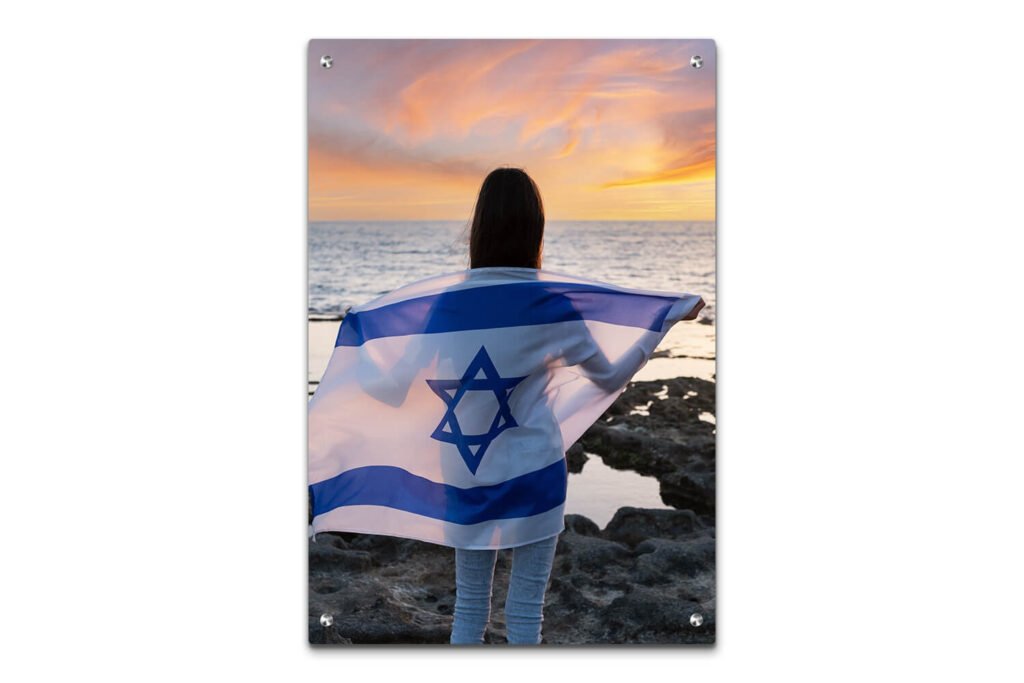 תמונת זכוכית – בחורה עם דגל ישראל בשקיעה S9041