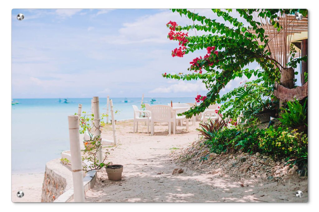 תמונת זכוכית – סצנת חוף עם כיסאות ושולחנות על שפת הים S3067