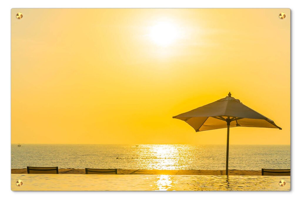 תמונת זכוכית – חוף עם שמשיות בשקיעה S3088