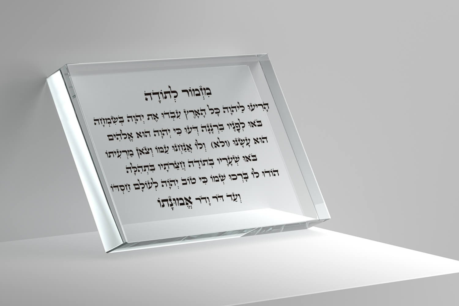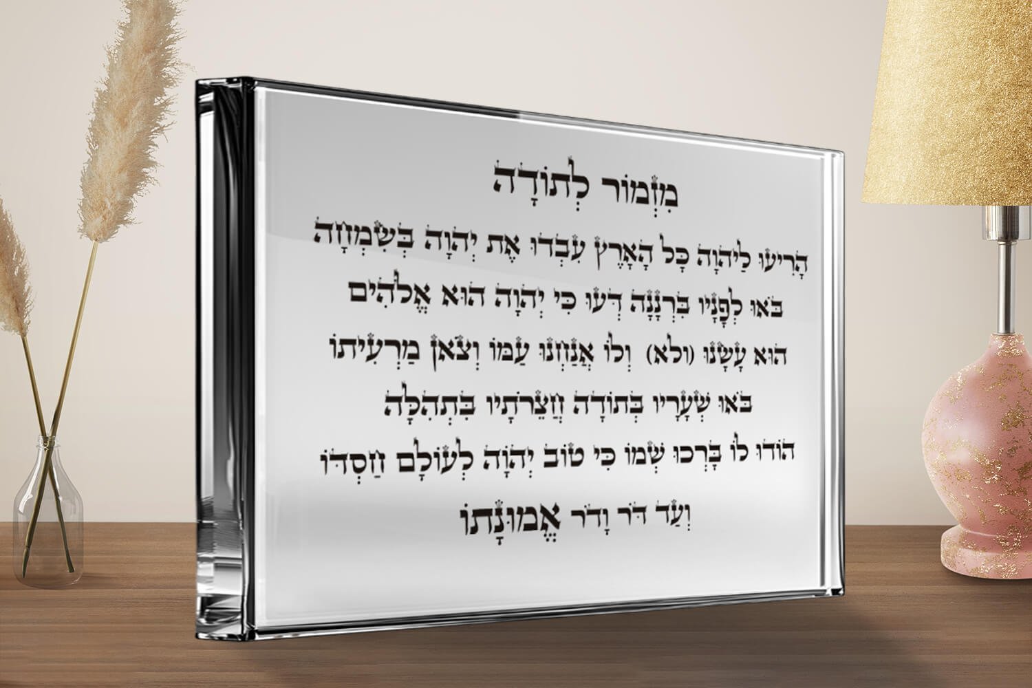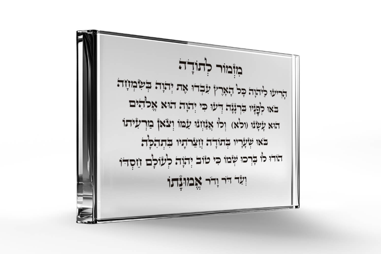 זכוכית אקרילית מרובעת בגודל 20 על 30 ס"מ. טקסט מספר תהילים פרק ק -"מזמור לתודה". רקע של התמונה שקוף. מתאים לעיצוב הבית, המשרד או כמתנה מיוחדת.