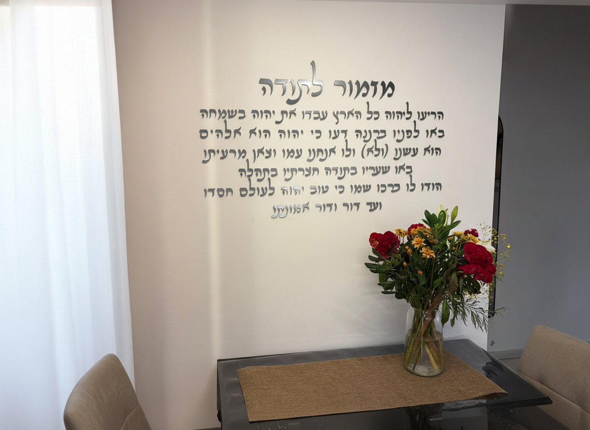 סט אותיות מרחפות של מזמור לתודה, חתוך בדיוק CNC ובגימור פרספקס יוקרתי.