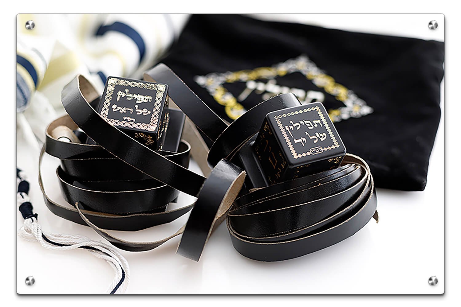 תמונת זכוכית המציגה זוג תפילין עור שחור בעיצוב עדין ומדויק. התפילין מונחים באופן הדוק, עם קופסה קטנה אחת הנראית בולטת יותר מהשנייה. ברקע לבן פשוט, נראית מעט תיק קטנטן מצמר שחור המוסתר מאחור. בחלקה העליון השמאלי של התמונה, בולט חלק מטלית תפילה עם פסים כחולים ולבנים. בתחתית התמונה מוצגת כתיבה בעברית בגופן חסר, בצבע כחול כהה, המוסיפה לתמונה תחושת קדושה ורוחניות.