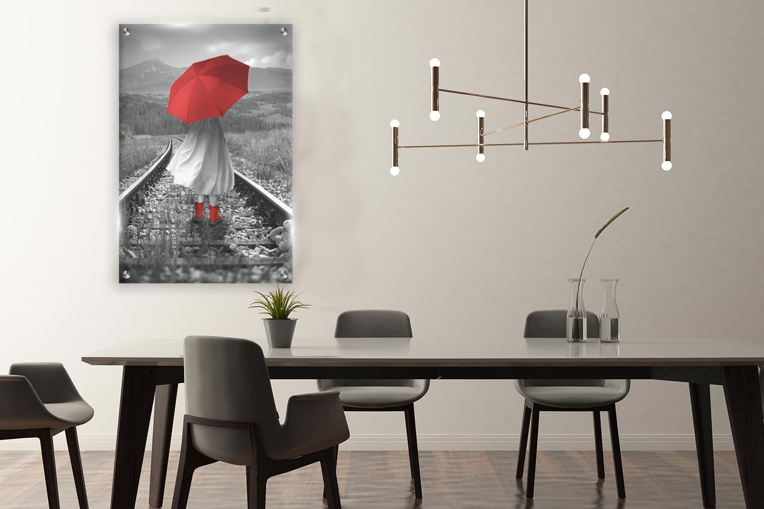 תמונת זכוכית ייחודית עם דמות של ילדה מחזיקה מטריה אדומה, על מסילת רכבת בלב נוף פתוח. התמונה מצוירת בשחור-לבן עם דגשים באדום שמוסיפים ניגודיות ועניין. אידיאלית לעיצוב חלל בית או משרד בסגנון דרמטי ועמוק.