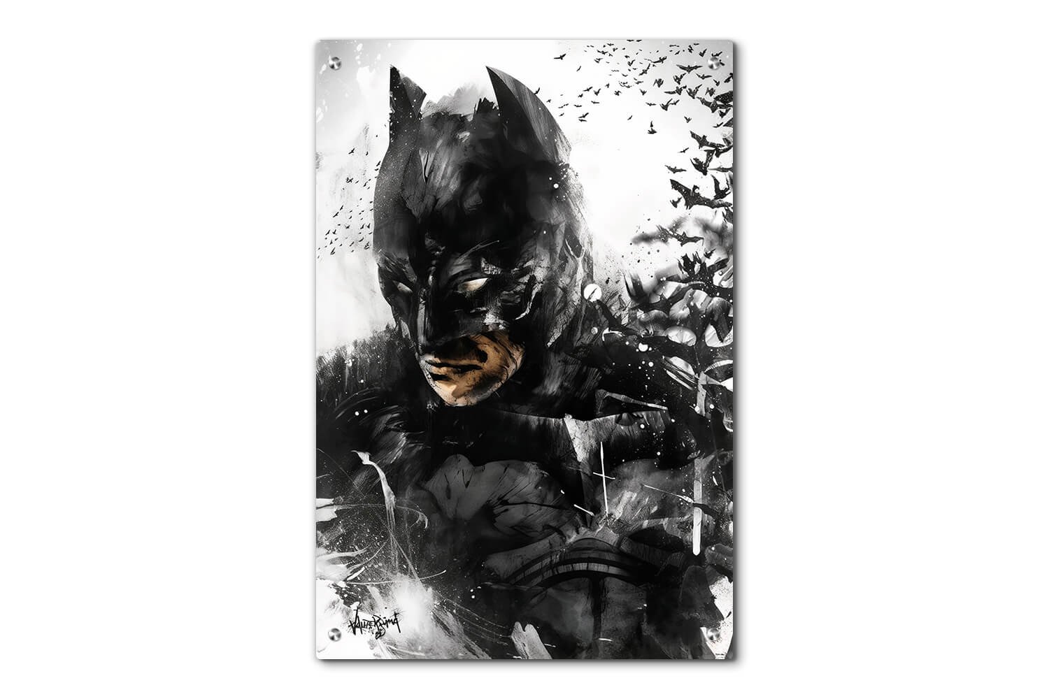 תמונה חזקה ומלאת עוצמה, מציגה את דמותו של באטמן בצורה יצירתית ודרמטית, עם חליפת שחור המעוטרת בגווני אפור שונים. כל התמונה משדרת תחושת סיפור אפל ודרמטי, עם מרקם חזק ומרשים. סגנון העבודה משלב בין טכניקות רישום ועבודת צבע שגורמות לתמונה להיראות כאילו נוצרה בעבודת יד, עם שכבות טקסטורליות עשירות.