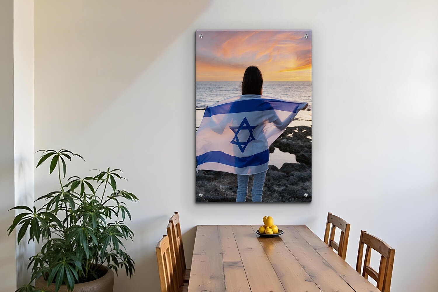 תמונת זכוכית תופסת את הרגע המרגש של בחורה עומדת עם דגל ישראל פרוש עליה, ברקע של שקיעה על חוף סלעי. הצילום מודבק על גבי חומר מבריק, עם חורי מתכת קטנים מאוד בכל פינה של התמונה, המשדרים תחושה של עיצוב מודרני ומרשים.