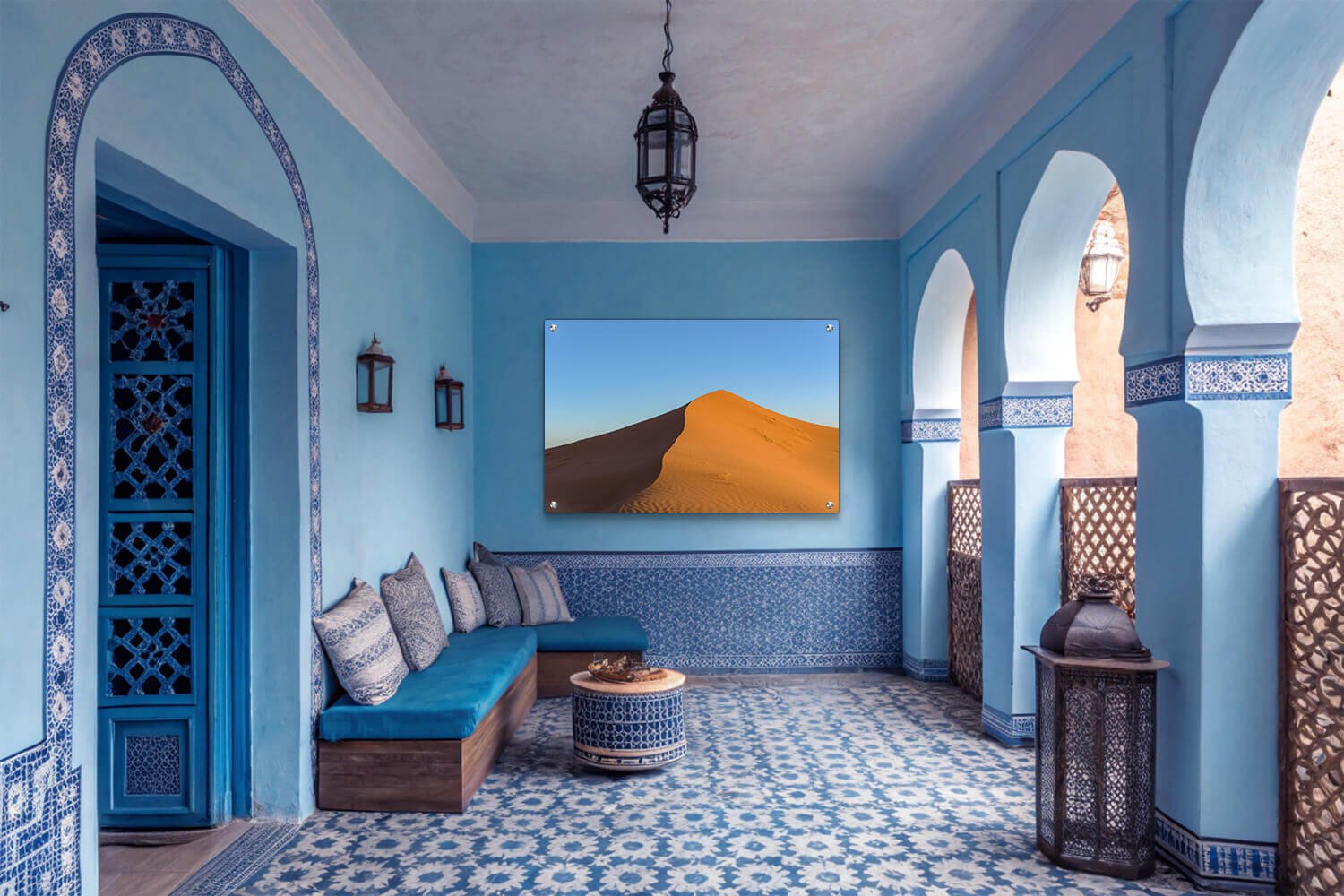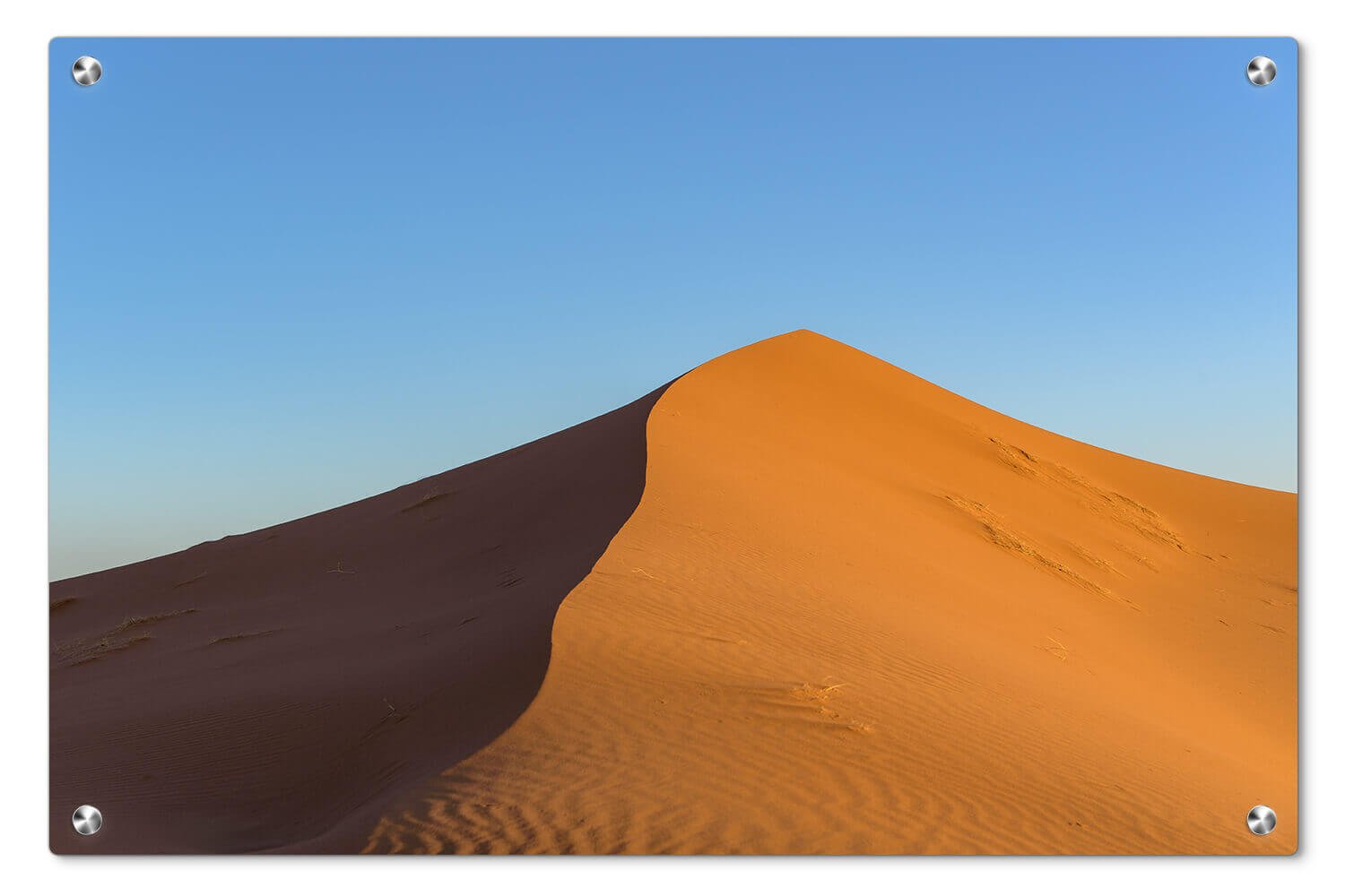 הסצנה מציגה את היופי של המדבר, עם דיונה חולית שמתחילה להתמתן לכיוון האופק. השמיים הכחולים נותנים ניגוד טבעי לצבעי הזהב והחום של החול, ומדגישים את השקט והפשטות של הסביבה המדברית.