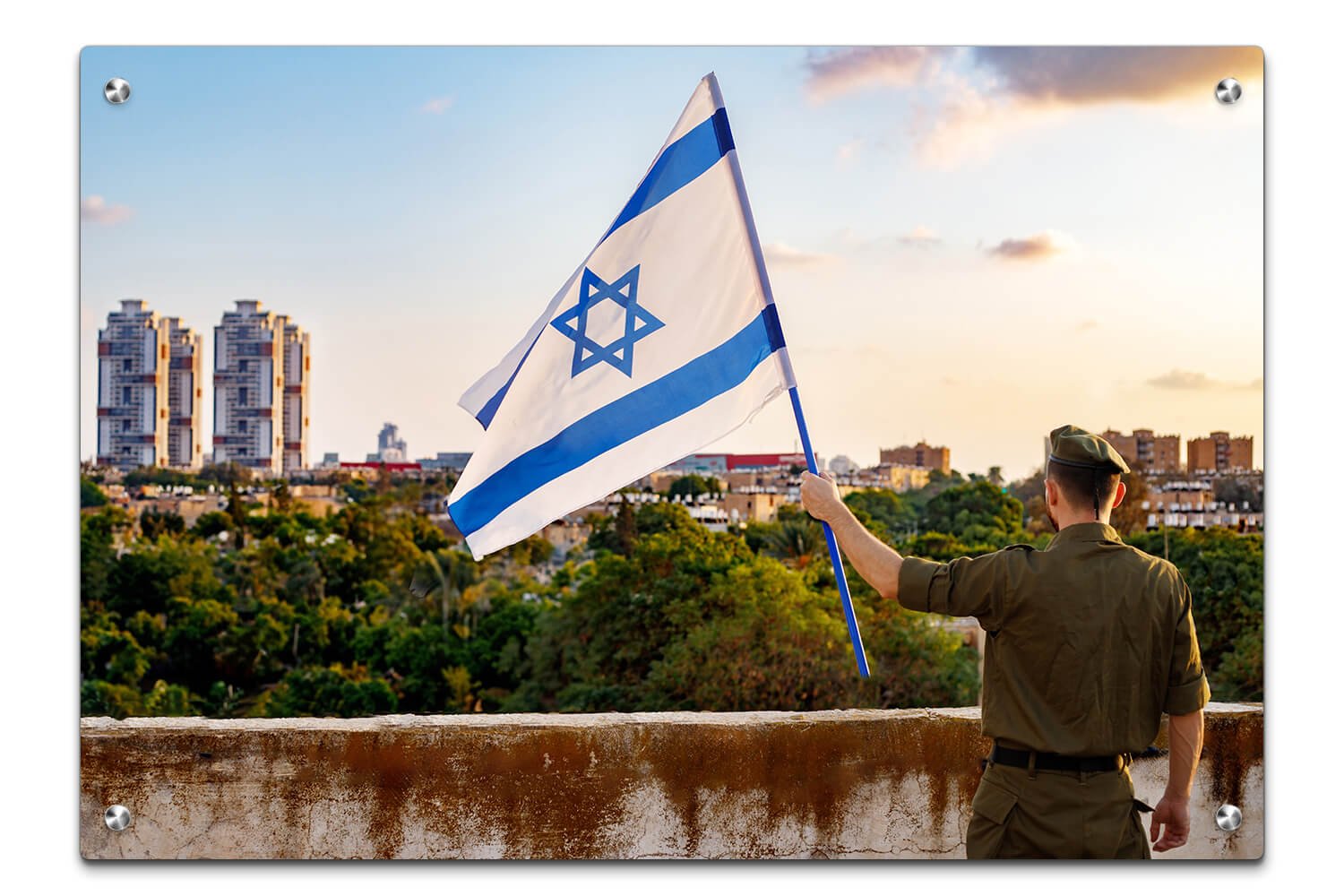 תמונת זכוכית עם יצירה אבסטרקטית של חמש דמויות סטיליזטיביות על רקע צבעים רכים של טורקיז, ורוד ולבן. הדמויות מעוצבות בצורות גיאומטריות ובצבעים עזים.