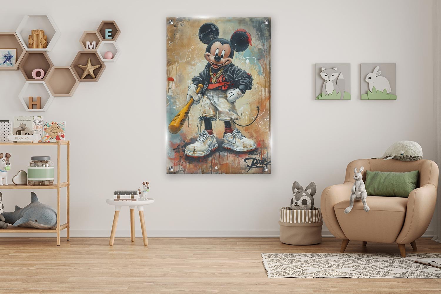 התמונה מציגה דמות עם סגנון ייחודי, חבושה בכובע, לבושה בבגדים רחבים ומחזיקה בבת עץ. הפוסטר משדר תחושת עוצמה ונחישות, מושלם לקישוט חללים שונים בבית או במשרד.
