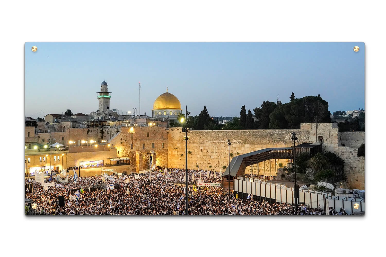 תמונה מרהיבה על זכוכית המציגה את הכותל המערבי מזווית רחבה, בנוף מלא רגש ורוחניות. בחלק הקדמי של התמונה נראית קבוצה גדולה של מתפללים לבושים בגדים בהירים, ממלאים את האזור שמתחת לאבני הכותל המרשימות. ברקע מתבלט כיפת הסלע הזהובה, לצד מבנים עתיקים ואור העיר שמטיל זוהר חם על המקום הקדוש. השמיים בצבעי כחול עדין מדגישים את שעות בין הערביים ויוצרים תחושת רוגע ושלווה.