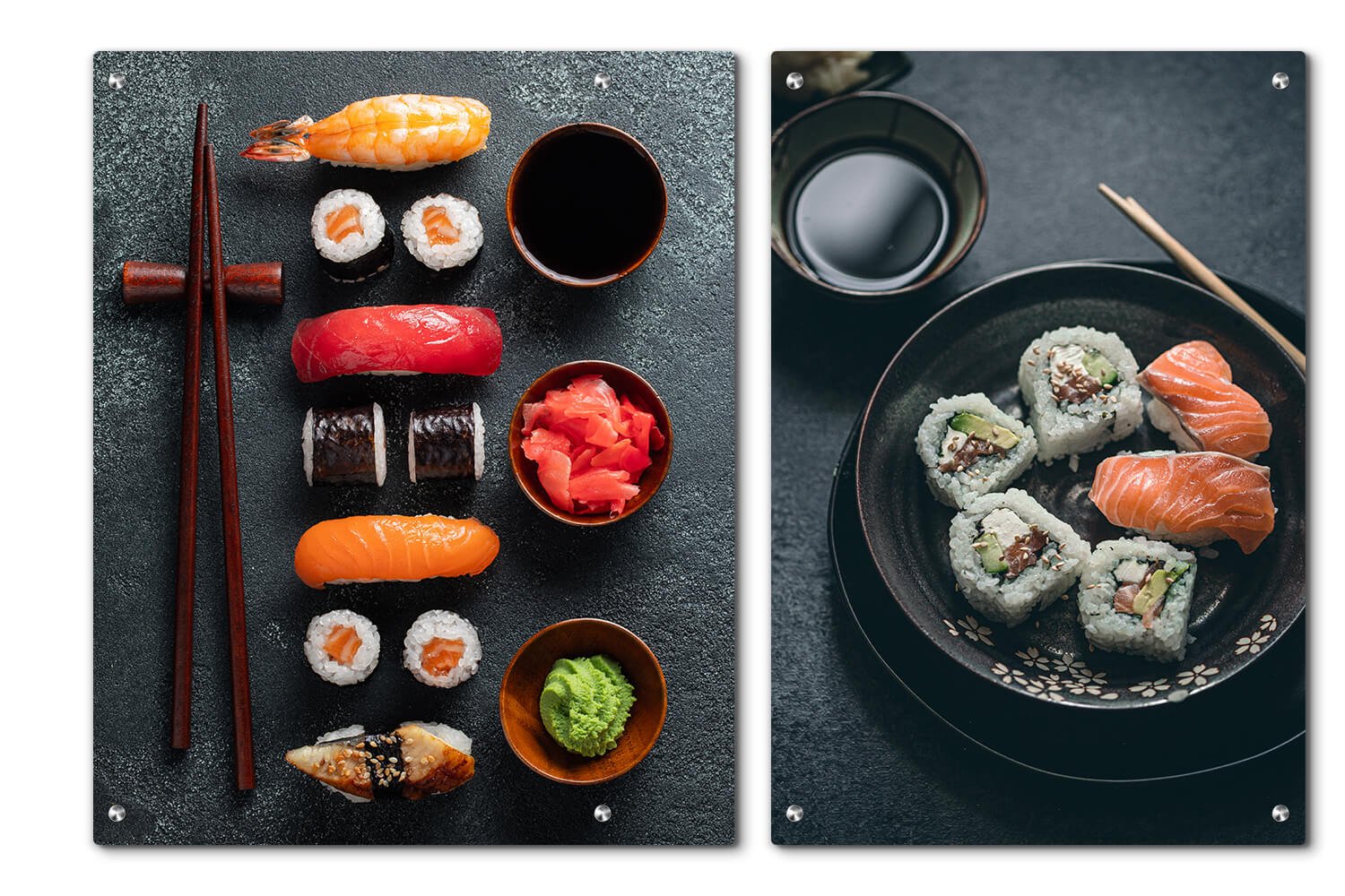 סט תמונות זכוכית זו מציג ארוחת סושי עשירה, הכוללת שתי פלטות סושי מעוצבות ומגוונות. כל פלטה מציעה שילוב מרהיב של רולים עם דג טרי, סלמון, אבוקדו, גבינת שמנת ושרימפס. התמונה מצולמת בגבוהים, וכוללת קעריות ג'ינג'ר, וואסבי ורוטב סויה לצד כל פלטה. הרקע הכהה מדגיש את הצבעים והמרקמים השונים של כל רכיב, יוצרת תחושת רעננות וטריות.