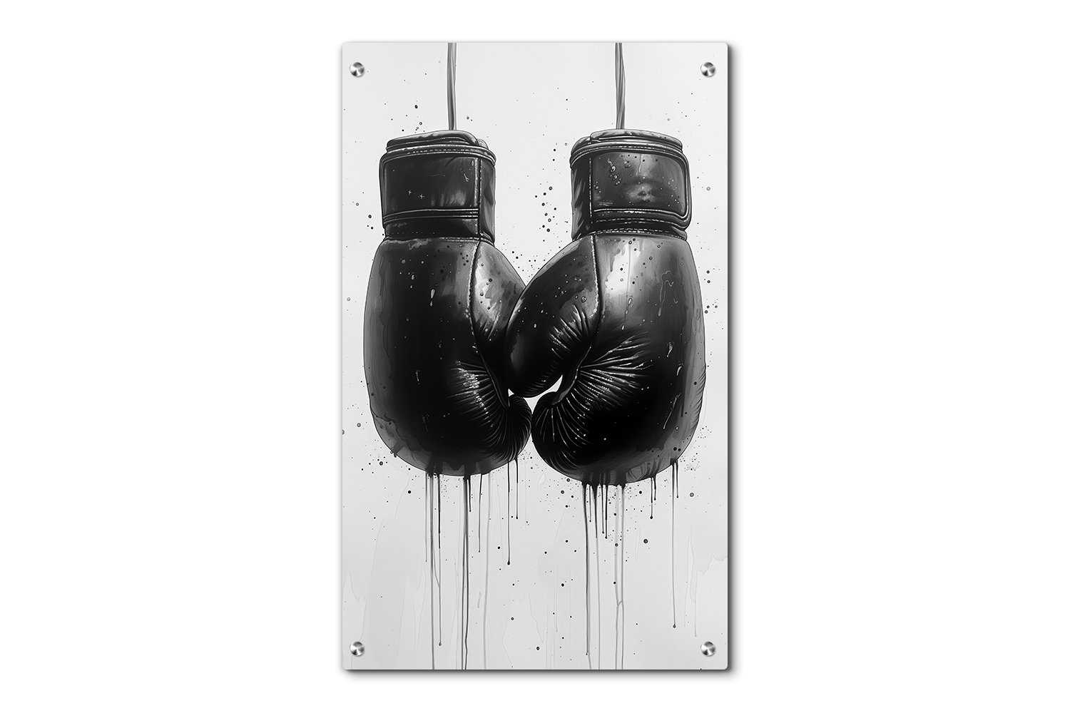 תמונת זכוכית בעיצוב מינימליסטי בשחור-לבן, מציגה זוג כפפות אגרוף שחורות ומחוספסות, המעוררות תחושה של כוח ונחישות. הכפפות נראות ישנות עם טקסטורה שמרמזת על חומר עור. סביבן יש אפקטים של צבע נוזלי שזורם ומתפשט, מה שמוסיף לדינמיות ולדרמטיות של התמונה.