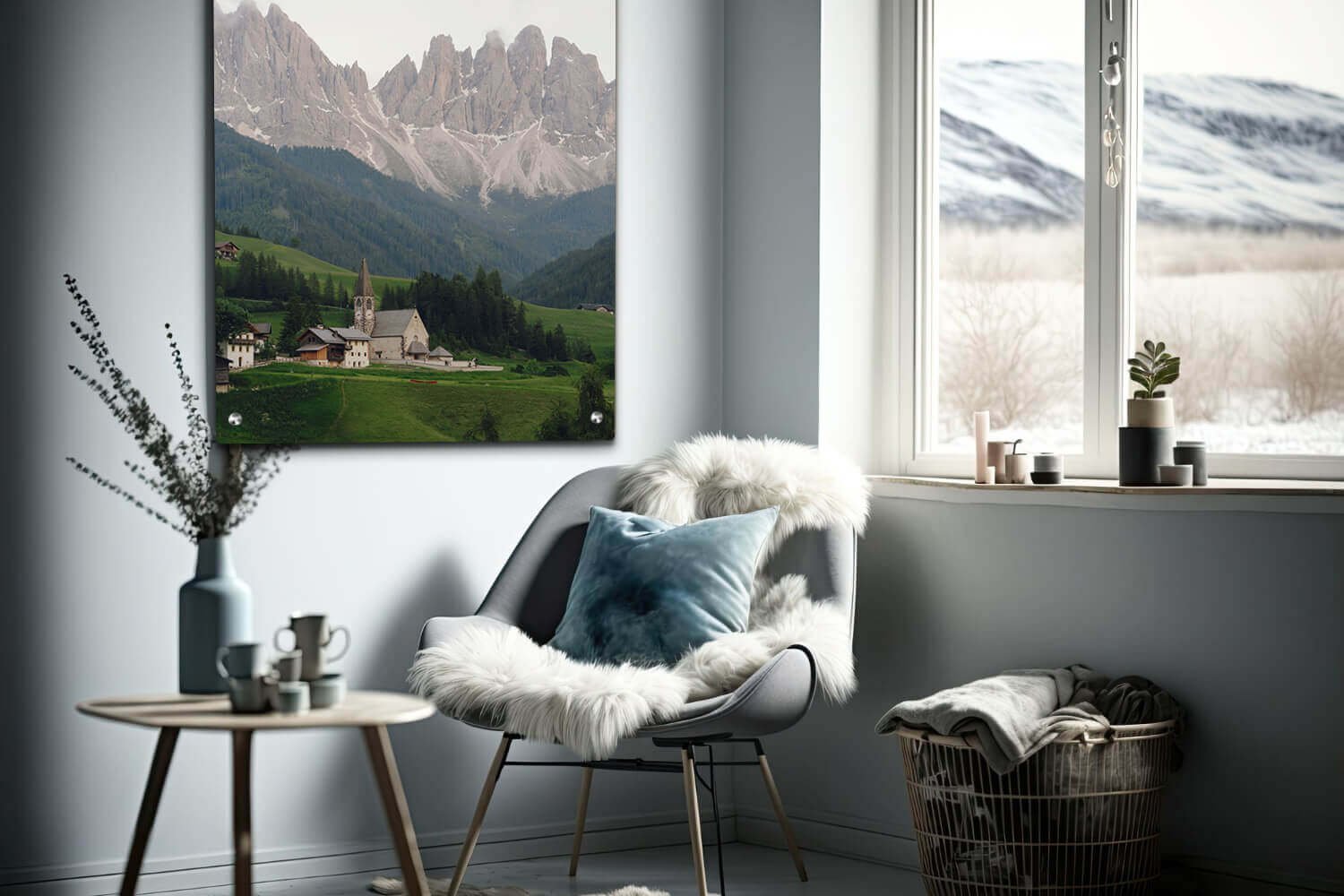 תמונת זכוכית מרהיבה המציגה כפר ציורי השוכן בין גבעות ירוקות ומרגלות פסגות הרים מרשימות. מגדל כנסייה גבוה מתנשא לשמיים, בעוד ההרים הגבוהים מספקים רקע דרמטי וקסום.