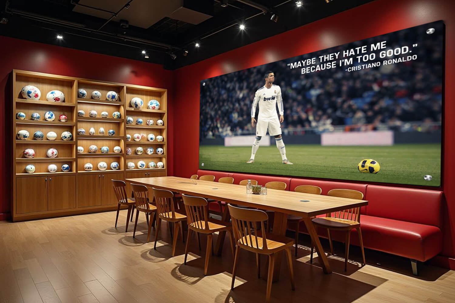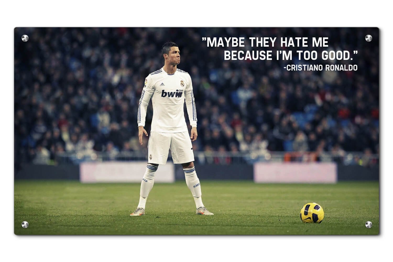 תמונת זכוכית מרהיבה המציגה את אגדת הכדורגל כריסטיאנו רונאלדו במגרש כדורגל ירוק, לבוש בתלבושת לבנה ארוכת שרוולים עם הלוגו "bwin". רונאלדו מופיע בתנוחה מלאת ביטחון, כשציטוט מעורר השראה מופיע מעל דמותו: "MAYBE THEY HATE ME BECAUSE I'M TOO GOOD." ומתחתיו חתימתו באנגלית "-CRISTIANO RONALDO-".