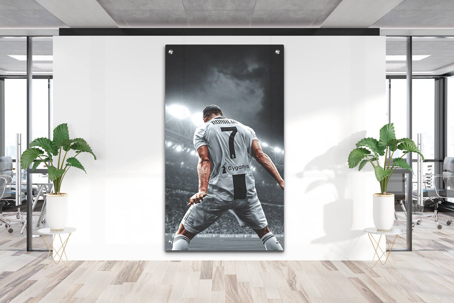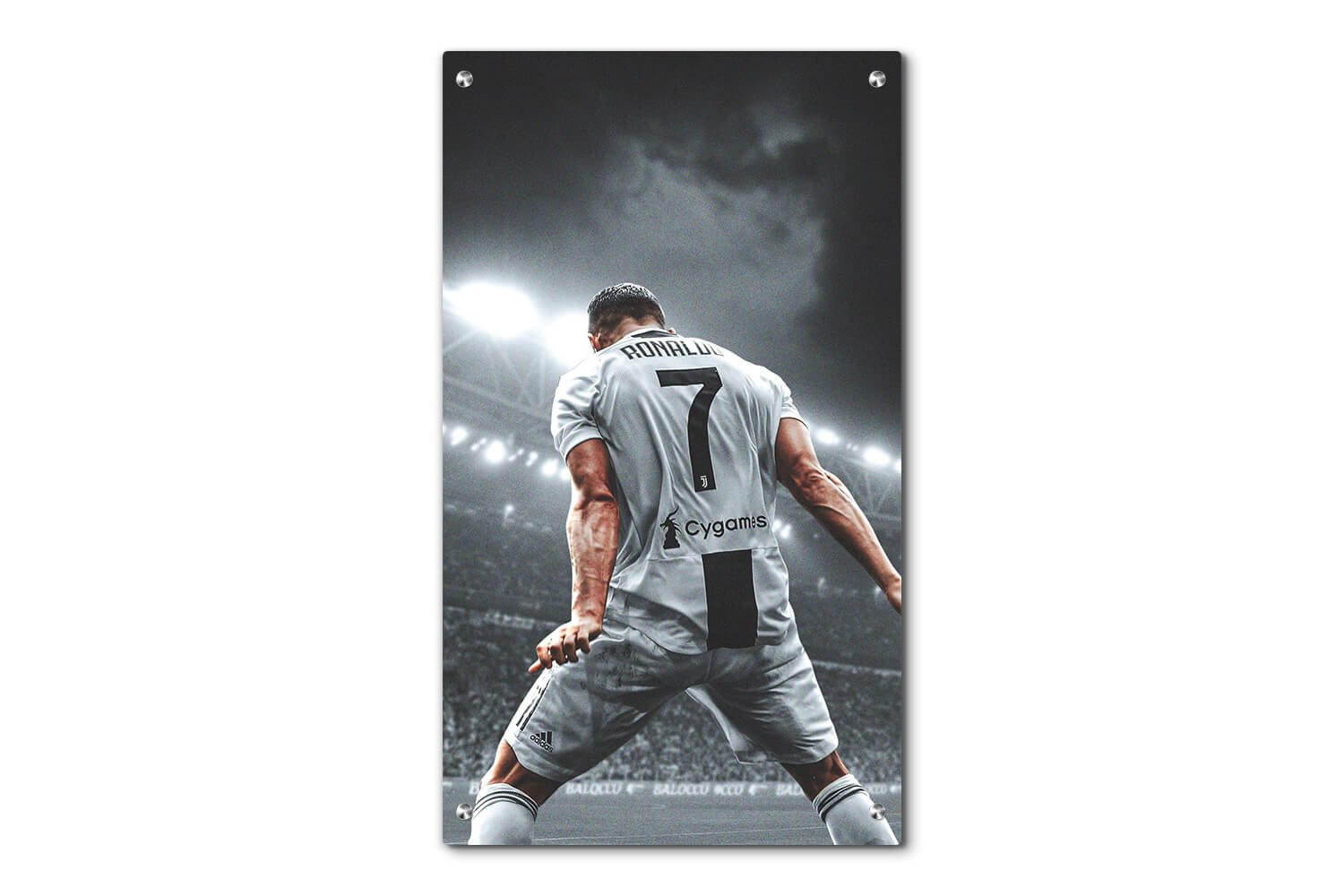 תמונת זכוכית עוצרת נשימה, מציגה את כריסטיאנו רונאלדו בתנוחה דינמית, עם ידיים מורמות, כאילו לרגל חגיגה לאחר הצלחה במגרש. הוא לובש חולצת כדורגל לבנה עם פרטים בשחור ואפור, והמספר 7 בולט בגב החולצה. הרקע כולל אצטדיון עם אורות ומספר רב של אוהדים במרחק, מוסיפים לתחושת הדרמטיות שבסצנה.
