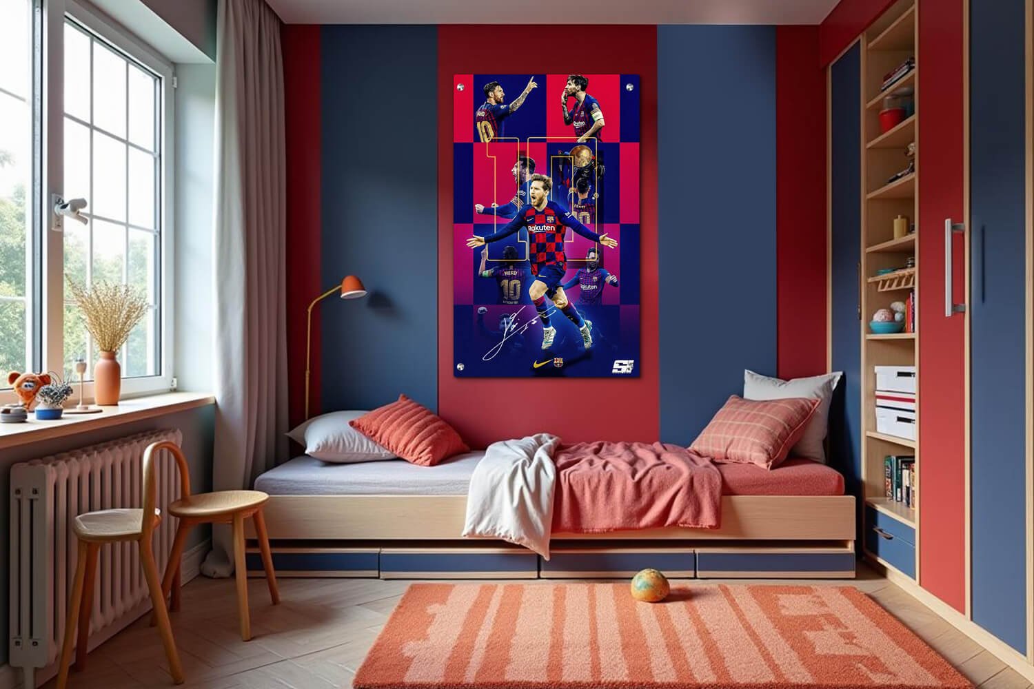 תמונת זכוכית בעיצוב גרפי עשיר, הכוללת קולאז' של תמונות של ליאונל מסי במגוון תנוחות פעולה. הרקע עשוי מצבעים עזים של אדום, סגול כהה, עם דוגמת לוח משבצות גרפית. המספר "10" (מספר החולצה של מסי) מוצג בצורה מודגשת וסטיליסטית, כחלק מהעיצוב. גווני זהב וצהוב בהיר משמשים להדגשת אלמנטים חשובים בעיצוב, במיוחד כדי להדגיש את המספר 10.