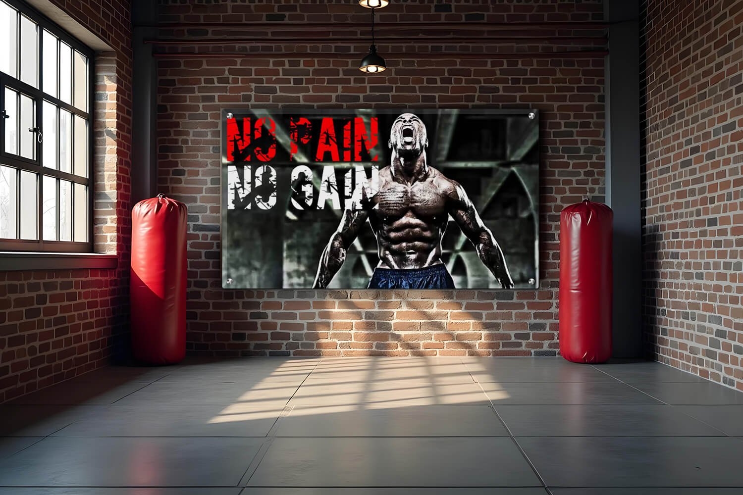 תמונת זכוכית ייחודית המציגה דמות של גבר חטוב ומפוסל פיזית, שעומד בתנוחת כוח לאחר אימון. הרקע של התמונה אפל, עם אלמנטים אורבניים כמו קירות בטון ומסגרות מתכתיות, והטקסט "NO PAIN NO GAIN" בולט על הרקע, מוסיף תחושת עוצמה ודחיפה. התמונה משרה אווירה של מוטיבציה ורצון עז להצלחה.