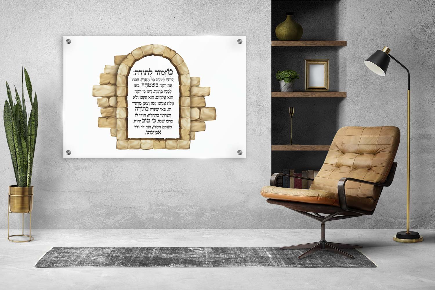 בתמונה מופיעה כתובת קודש על רקע של מסגרת אבן, המעניקה לתמונה תחושת עמידות ואותנטיות. התמונה מעבירה את המסר של רוחניות וחיבור למסורת, והעיצוב המיוחד שלה מושך את העין. זהו מוצר אידיאלי עבור חובבי יהדות ורוחניות.