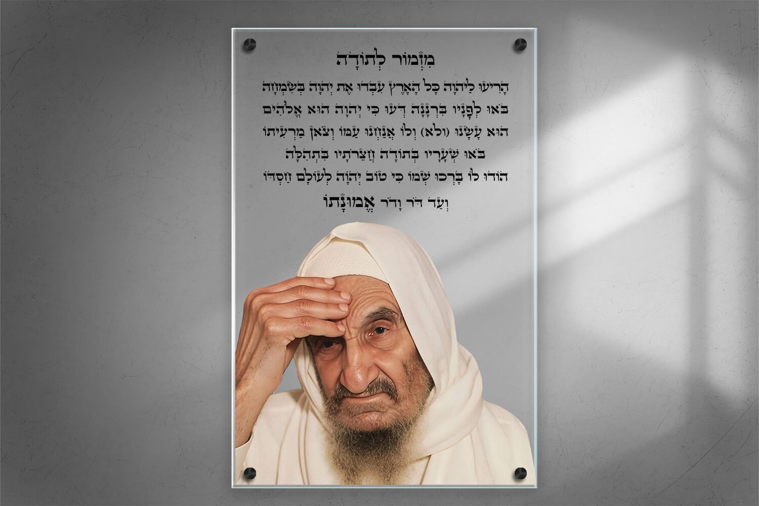תמונת זכוכית בעיצוב ייחודי, עם הכיתוב "מזמור לתודה". התמונה מעוצבת בהשראת סגנון דיוקנו של הבבא סאלי המשלב פשטות, עומק וקדושה. התמונה לאורך. ניתן לעצב לפי דרישת הלקוח.