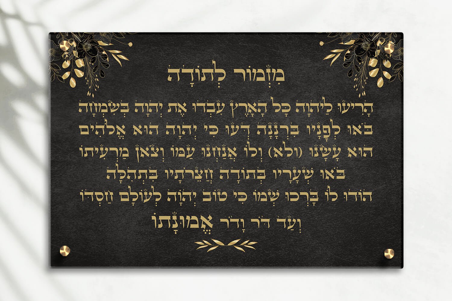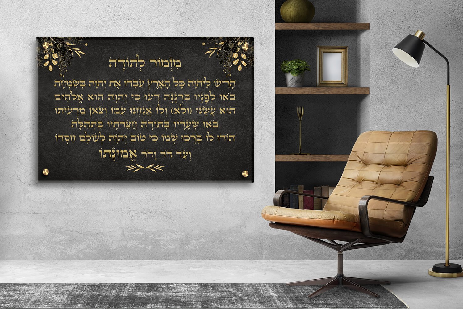 תמונת זכוכית-"מזמור לתודה". עיצוב יוקרתי על רקע כהה, מעוטר בפרטי זהב אלגנטיים. זמינה בפורמט רוחבי או אנכי – לפי בחירת הלקוח.