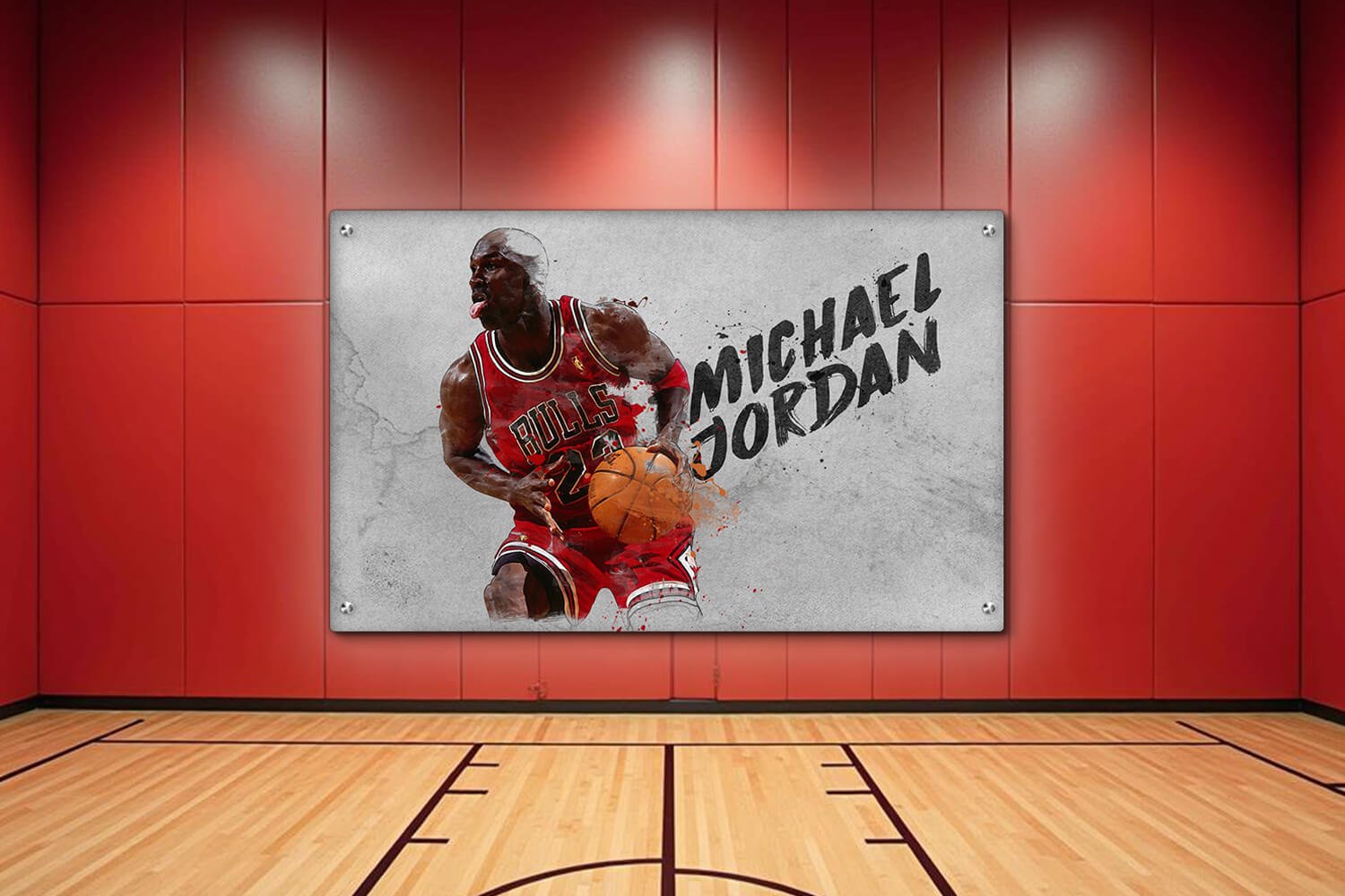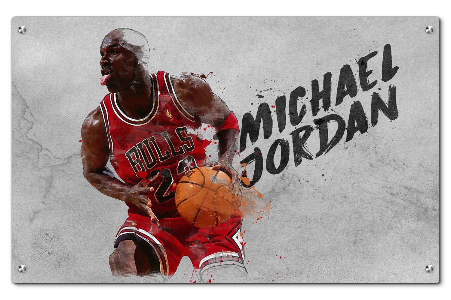 תמונת זכוכית ייחודית עם עיצוב גרפי המנציח את מייקל ג'ורדן בפעולה דינמית ומלאת עוצמה. הדמות מוצגת בצורה מדויקת בגופיית כדורסל אדומה-שחורה עם המספר "23" המפורסם. הרקע משלב גווני אפור בהיר וכהה עם טקסטורת בטון ונגיעות מברשות ליצירת מראה מחוספס ודינמי. הטקסט "MICHAEL JORDAN" מופיע בצורה בולטת, באותיות שחורות ובסגנון גרפי ייחודי. השילוב בין האלמנטים יוצר תמונה עוצמתית שמתאימה לכל חלל המעוניין באווירה ספורטיבית והשראתית.