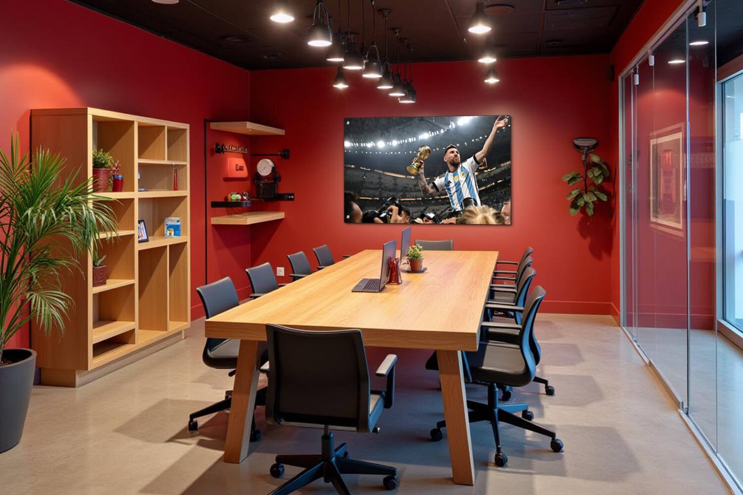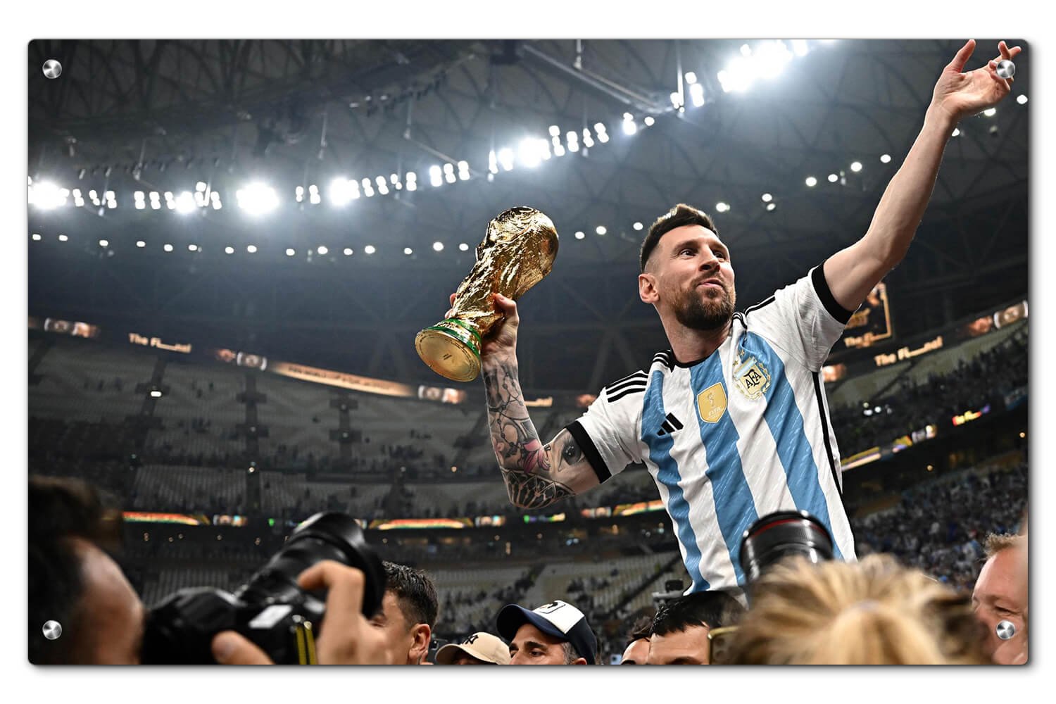 תמונת זכוכית מרהיבה הממחישה את הרגע היסטורי בו ליונל מסי אוחז בגביע העולם לאחר זכייתו עם נבחרת ארגנטינה. התמונה מציגה את מסי במרכז התמונה, לובש את חולצת הנבחרת הארגנטינאית עם פסים בצבעים לבן וכחול בהיר, עם עיניים מלאות גאווה ושמחה. סביבו אוהדים מריעים, ומאחוריו מתנשאת האווירה החגיגית של אצטדיון מלא בקהל נלהב. התמונות המוארת, האור הבוהק והגביע המוזהב כל אחד מהם מביע ניצחון והישג ספורטיבי עצום.