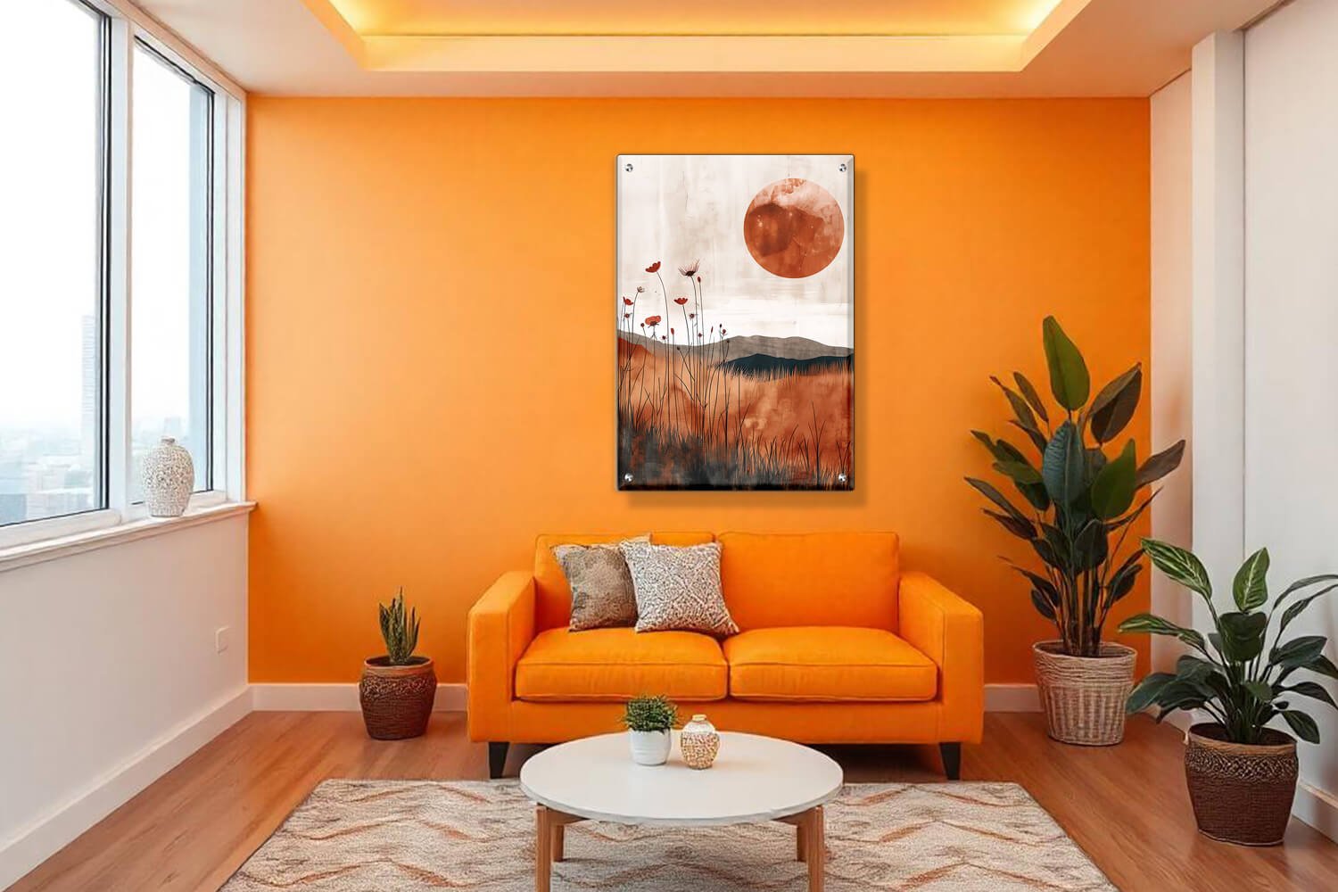 תמונת זכוכית אומנותית המציגה נוף מופשט ורוגע. השמיים בגוון בז' קרם עם עיגול כתום-אדמדם המדמה שמש או ירח, בעוד השטח מתמלא בשדות עשב דהוי, הרים כהים ופרחים כתומים קטנים. יצירה שמשרה תחושת שלווה והרמוניה.