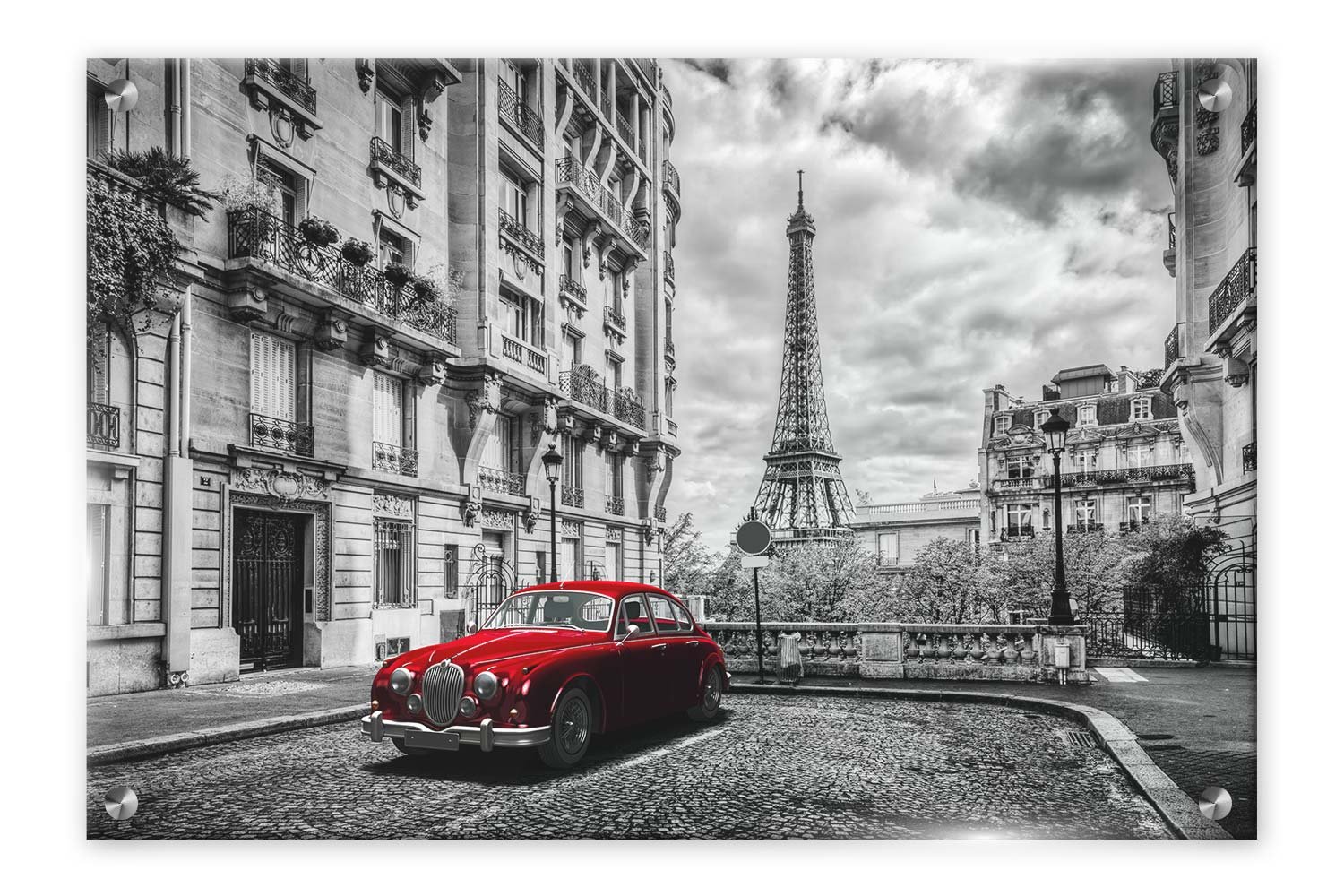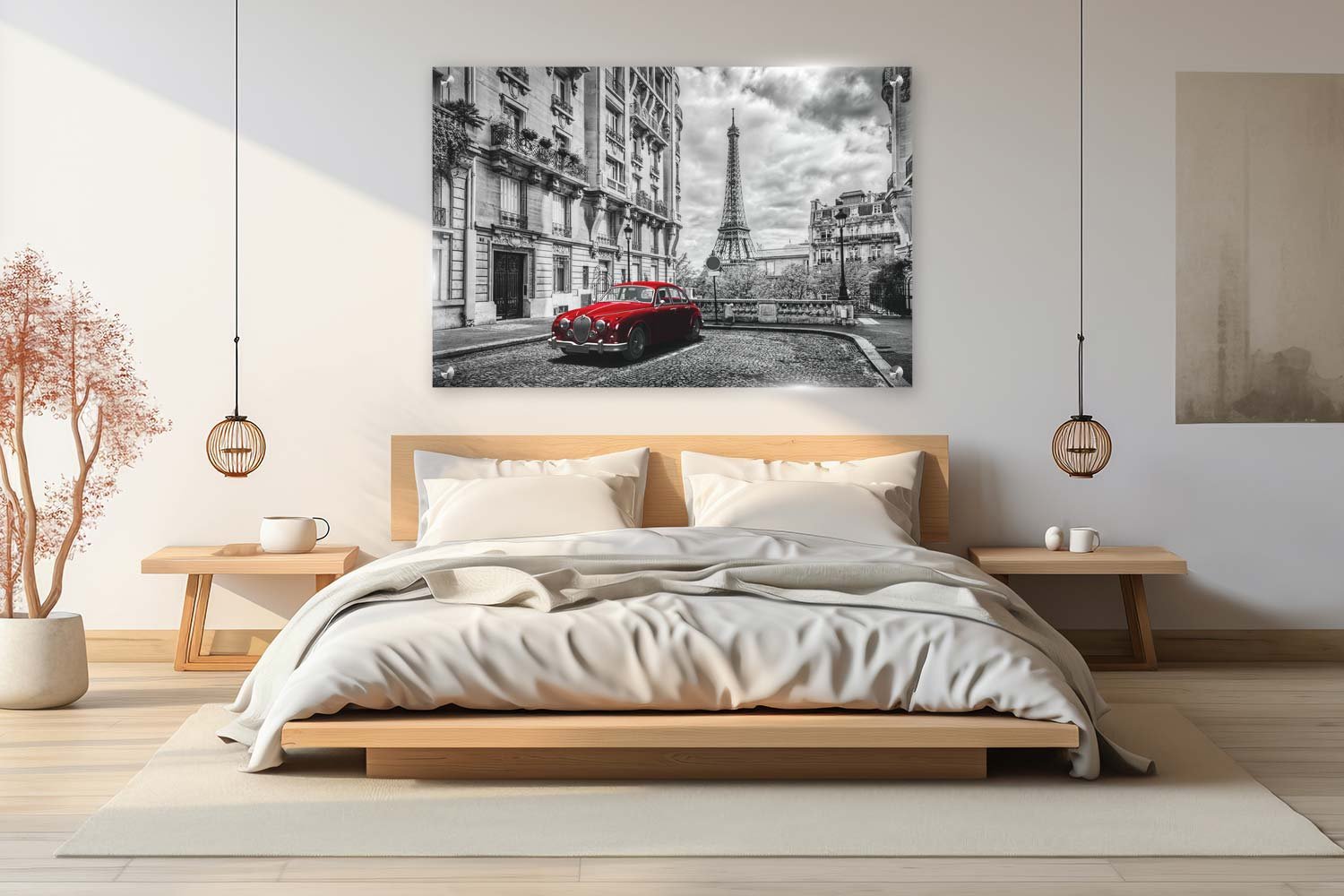 בתמונה מופיעה מכונית קלאסית בצבע אדום, הממוקמת ברחוב אבן ליד מגדל האייפל. הצבעים השחורים-לבנים של הנוף לבין מכונית האדומה יוצרים תחושת רומנטיקה ונוסטלגיה, מושלם לאוהבי אומנות ונופים אורבניים.