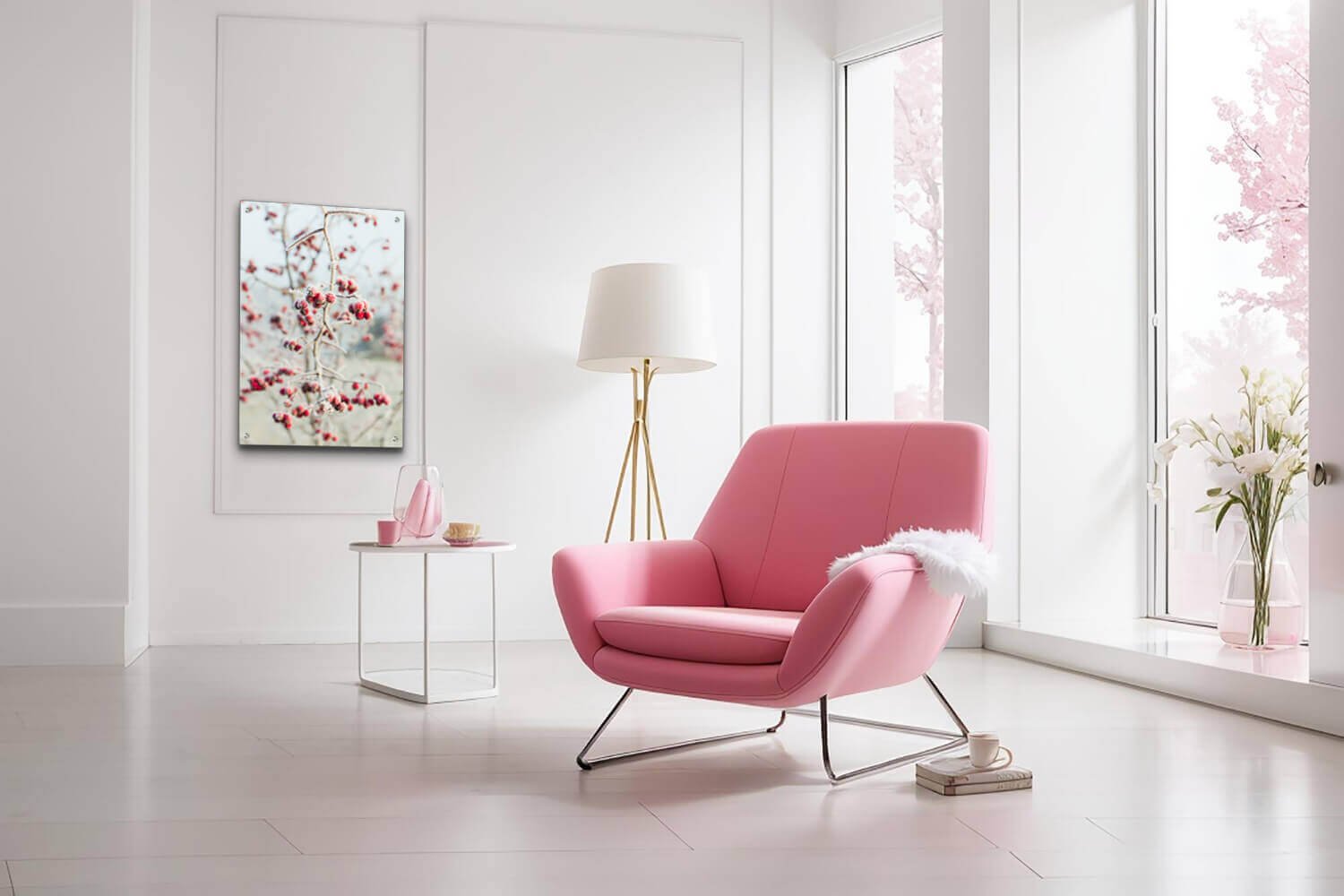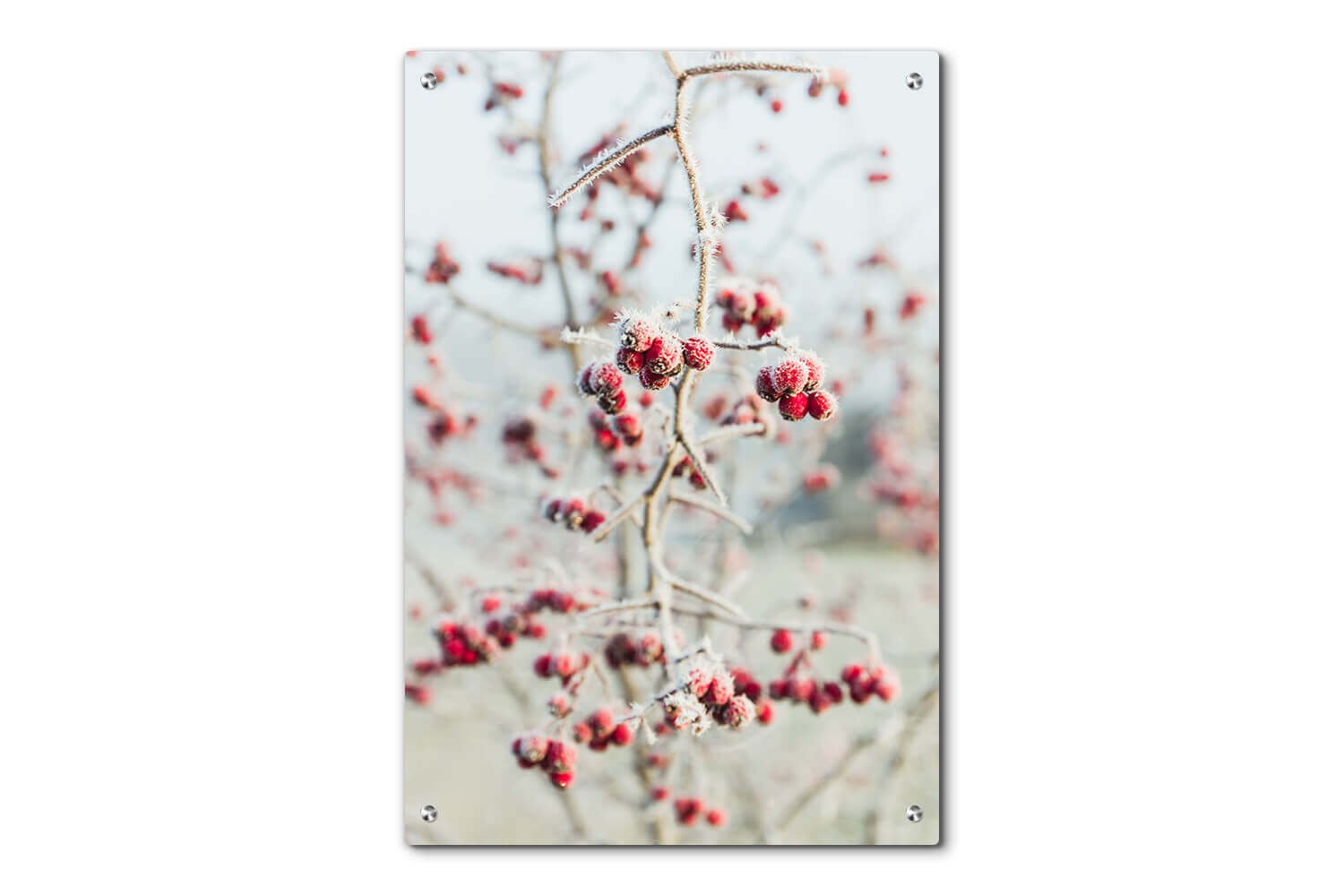 תמונה על זכוכית בעיצוב מרהיב המציגה ענף טבעי מלא בפירות אדומים קטנים, מכוסים בשכבת כפור לבנה המדגישה את הצבע האדום החי של הפירות. הענף יוצר תבנית צפופה של פירות ועלים, המשלבת יופי חורפי עם צבעוניות טבעית חזקה. הרקע מטושטש בגווני אפור-בז', המדגיש את החזית וממקד את תשומת הלב בפירות ובמרקם הכפור. התאורה הטבעית, שמקורה כנראה בשעות הבוקר המוקדמות או אחר הצהריים המאוחרות, מוסיפה לתחושת הרוך והאותנטיות של התמונה.