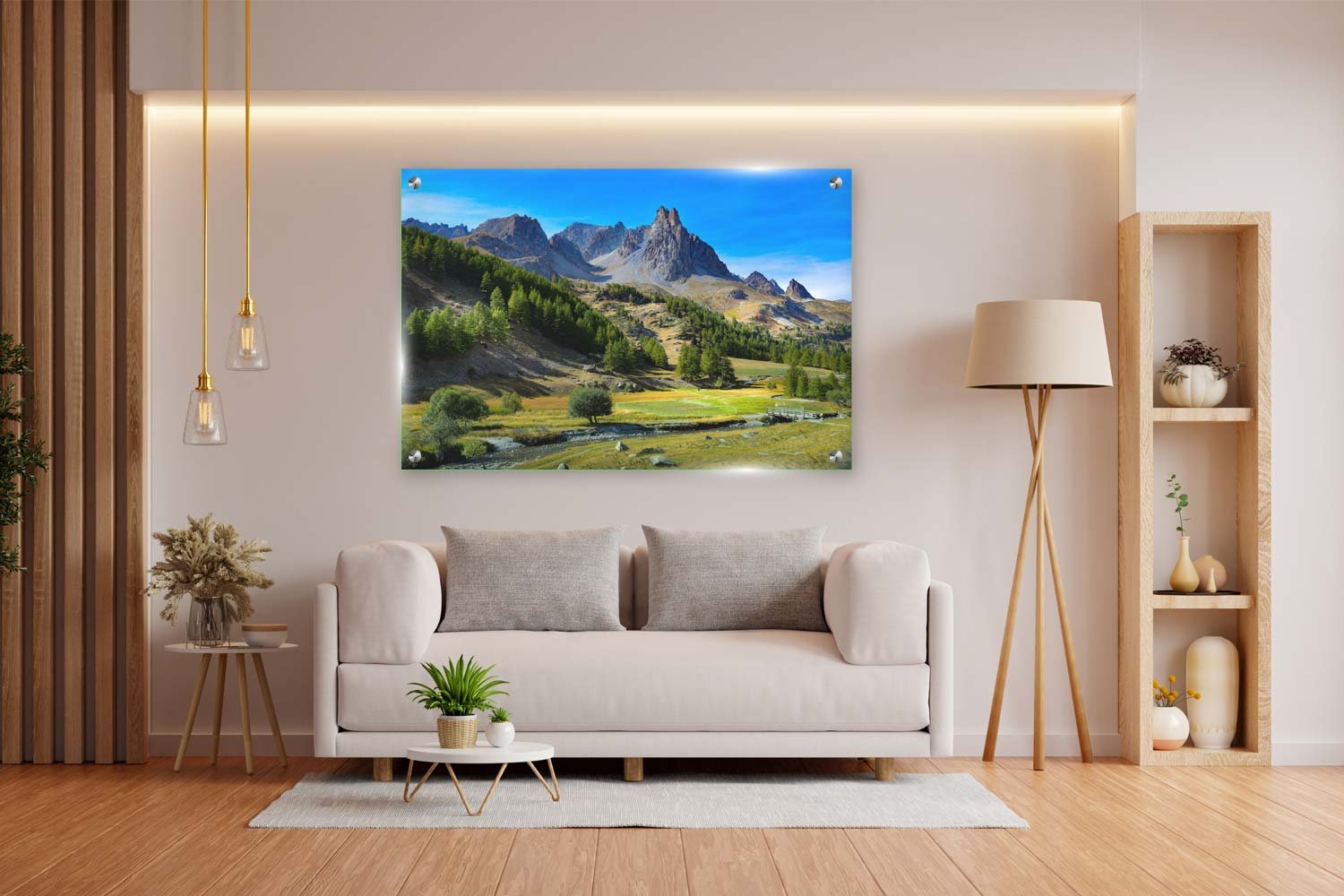 בתמונה מוצגות פסגות הרים דרמטיות המשתלבות עם צמחייה ירוקה, זרם מים קטן וגשר עתיק. השילוב המיוחד בין הטבע הפראי והשלווה השקטה מביא עומק ועניין לכל חלל.