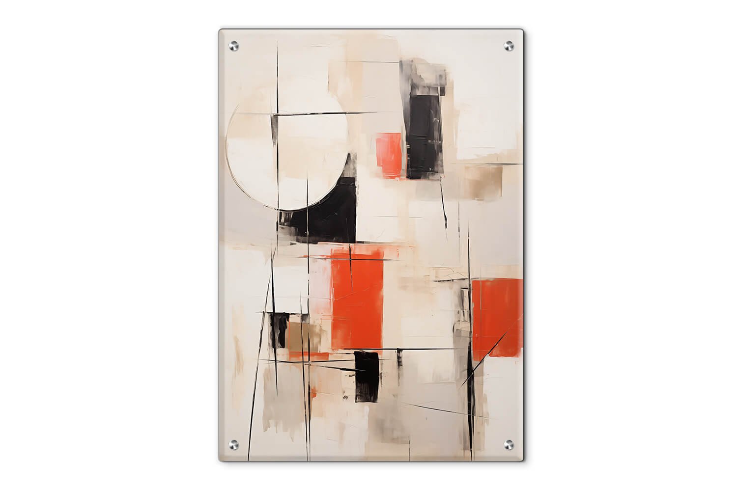 תמונת זכוכית זו מציגה ציור אבסטרקטי המורכב מצורות וצבעים שונים, בעיקר בגוונים של בז', שמנת, חום בהיר וכתום קלוי/אדום חלוד. הצורות נראית כמו שכבות המתרקמות זו על גבי זו, תוך יצירת תחושת עומק ומורכבות. הקווים המחלקים את הצורות שונים בגבולותיהם – לפעמים הם עבים וכהים, ולעיתים הם דקים ומעודנים, מה שיוצר תחושת תנועה והתקדמות בין השכבות השונות.
