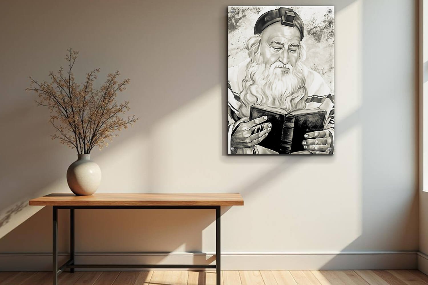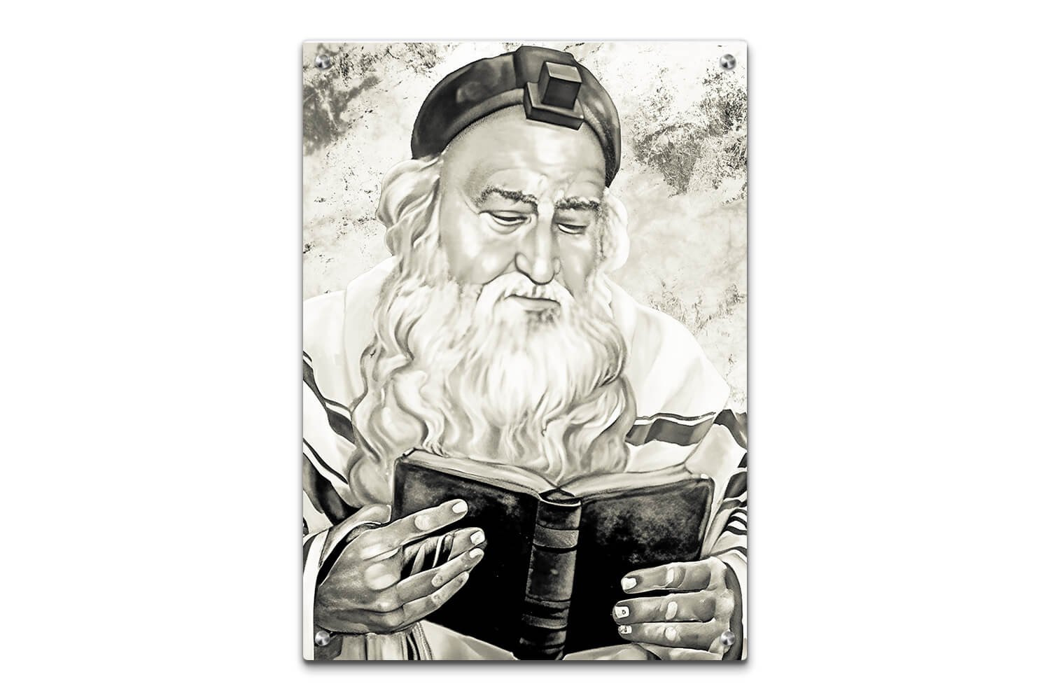 פורטרט ייחודי של רבי מאיר בעל הנס, המוצג בתמונת זכוכית מרשימה. הדמות מצוירת בסגנון ציורי עם פרטים עשירים הכוללים: זקן לבן-אפור ארוך וזורם, טלית מסורתית עם פסים כהים, וכיפה שחורה בעלת עיצוב ייחודי. הרב מתואר כשהוא שקוע בקריאת ספר פתוח, ככל הנראה טקסט דתי, מה שמעצים את האווירה הרוחנית בתמונה. הגוונים בציור תוססים ועשירים, ומציגים טכניקת משיכות מכחול ברורה, המדגישה את האופי האמנותי של היצירה.