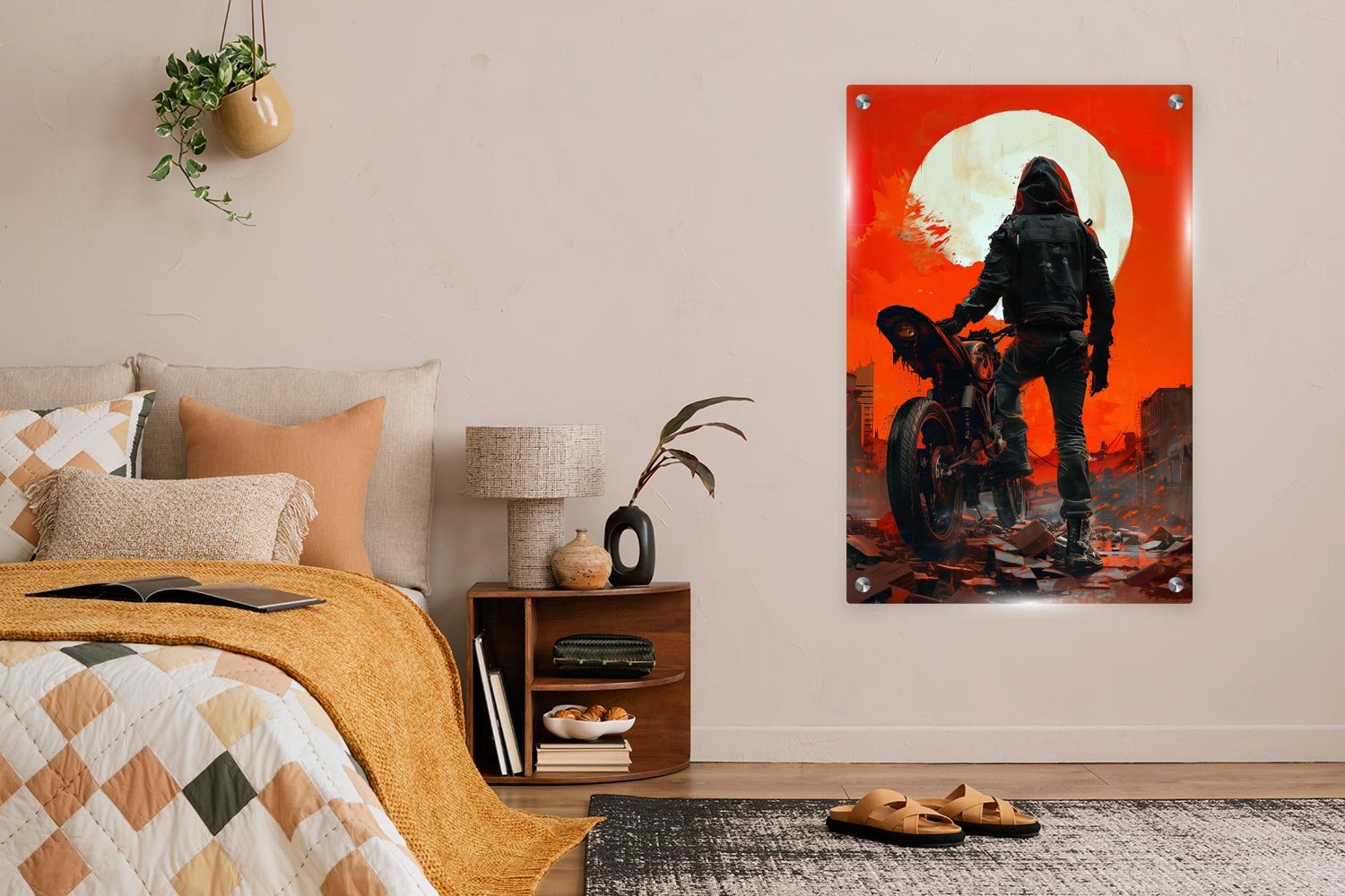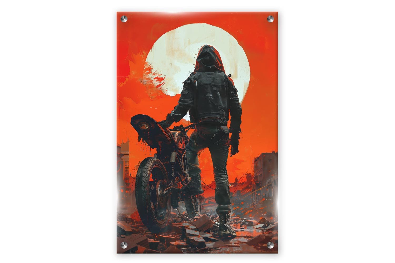 תמונת זכוכית עוצמתית של רוכב אופנוע העומד מול ירח אדום גדול ומלא ברקע של עיר אפלה. הציור משלב אווירה מסתורית ואפלה יחד עם עיצוב מודרני ודינמי. יצירה זו תוסיף דרמטיות ועומק לכל חלל ותעורר עניין במבט אחד