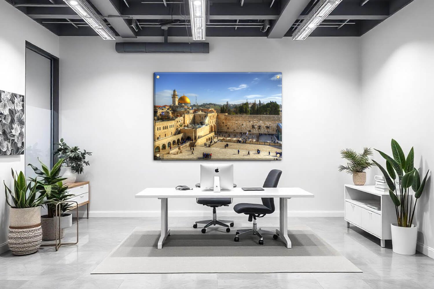 התמונה מתארת נוף מלא של רחבת הכותל המערבי בירושלים, עם חומת האבן העתיקה המשתרעת במרכז התמונה. ברחבה המרוצפת אבן בהירה נראים אנשים הפזורים ברחבי המקום, חלקם בלבוש מסורתי ורבים מהם בעיצומם של תפילה או ביקור במקום הקדוש. ברקע נפרש נוף העיר העתיקה של ירושלים, כולל מבנים עתיקים, עצים וצריחים. הכיפה המוזהבת של כיפת הסלע בולטת בצדה השמאלי של התמונה, יחד עם מבנים נוספים הסובבים אותה. השמיים הבהירים בגוון תכלת, עם עננים לבנים קלילים, מוסיפים לאווירה הנינוחה והחמימה של היום.