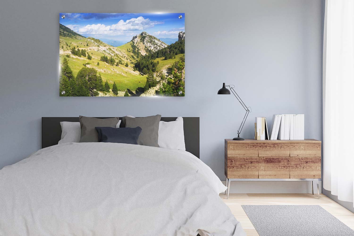 הוסיפו תחושת טבע עוצמתית וירוקה לביתכם עם תמונת זכוכית המציגה רכסים ירוקים ופסגות מרהיבות. הנוף הרגוע והמקום הפתוח יוצרים אווירה מרגיעה ושלווה.