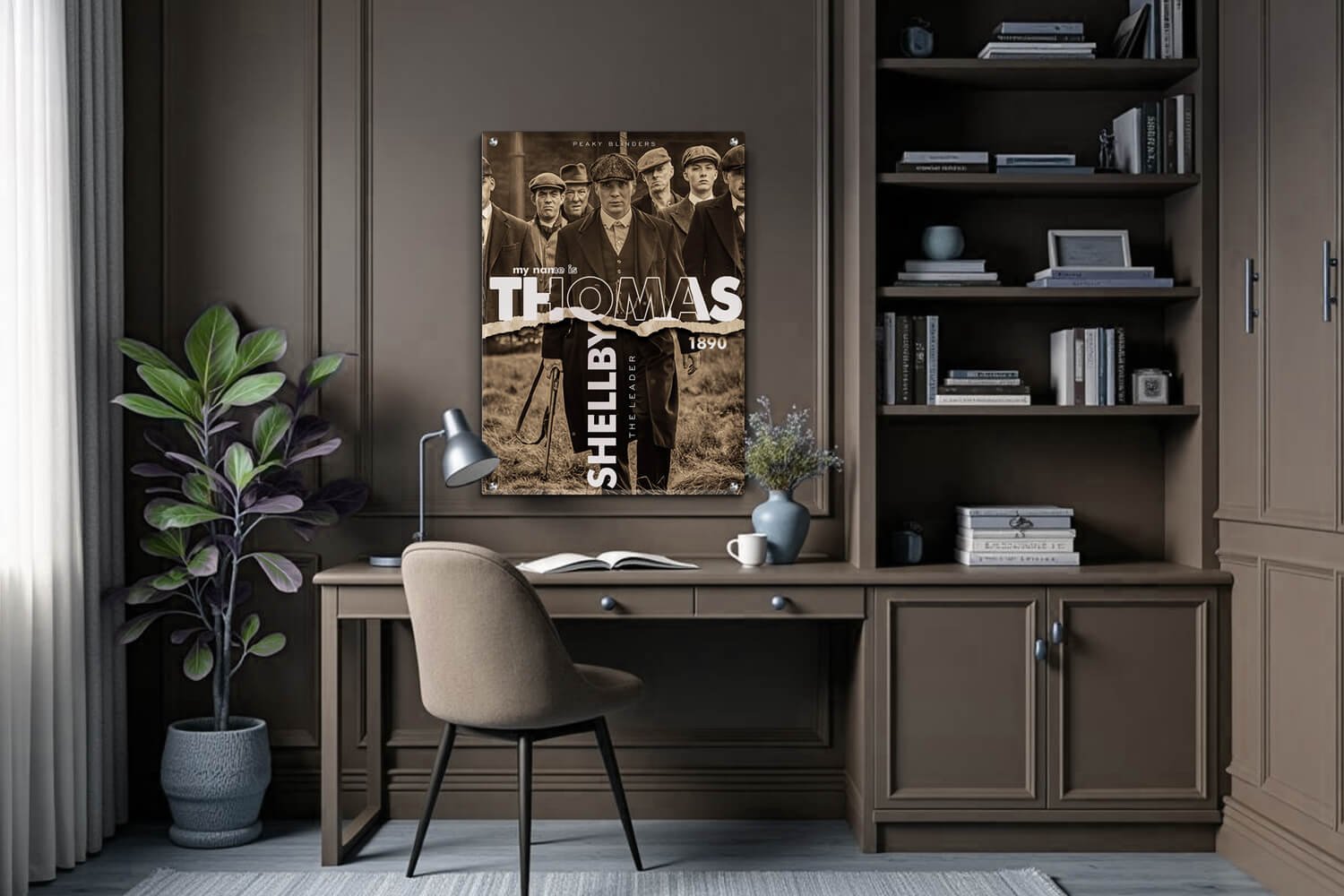 תמונה זכוכית שמציגה קבוצת גברים לבושים בחליפות וכובעים, עומדים או צועדים בשדה. כולל האפקטים של התאורה בגוון ספיה, יוצר תחושת עומק וייחודיות, כאילו מדובר בתמונה ישנה או פוסטר של סרט וינטג'. עיצוב נוסף עם המילים "PEARY BLINDERS" מופיע בחלק העליון, המשלב את תחושת הסרט והזמן. התמונה משדרת אווירה של סרטים ישנים והיסטוריה, ומושלמת לחובבי סגנון וינטג' וקולנוע קלאסי.