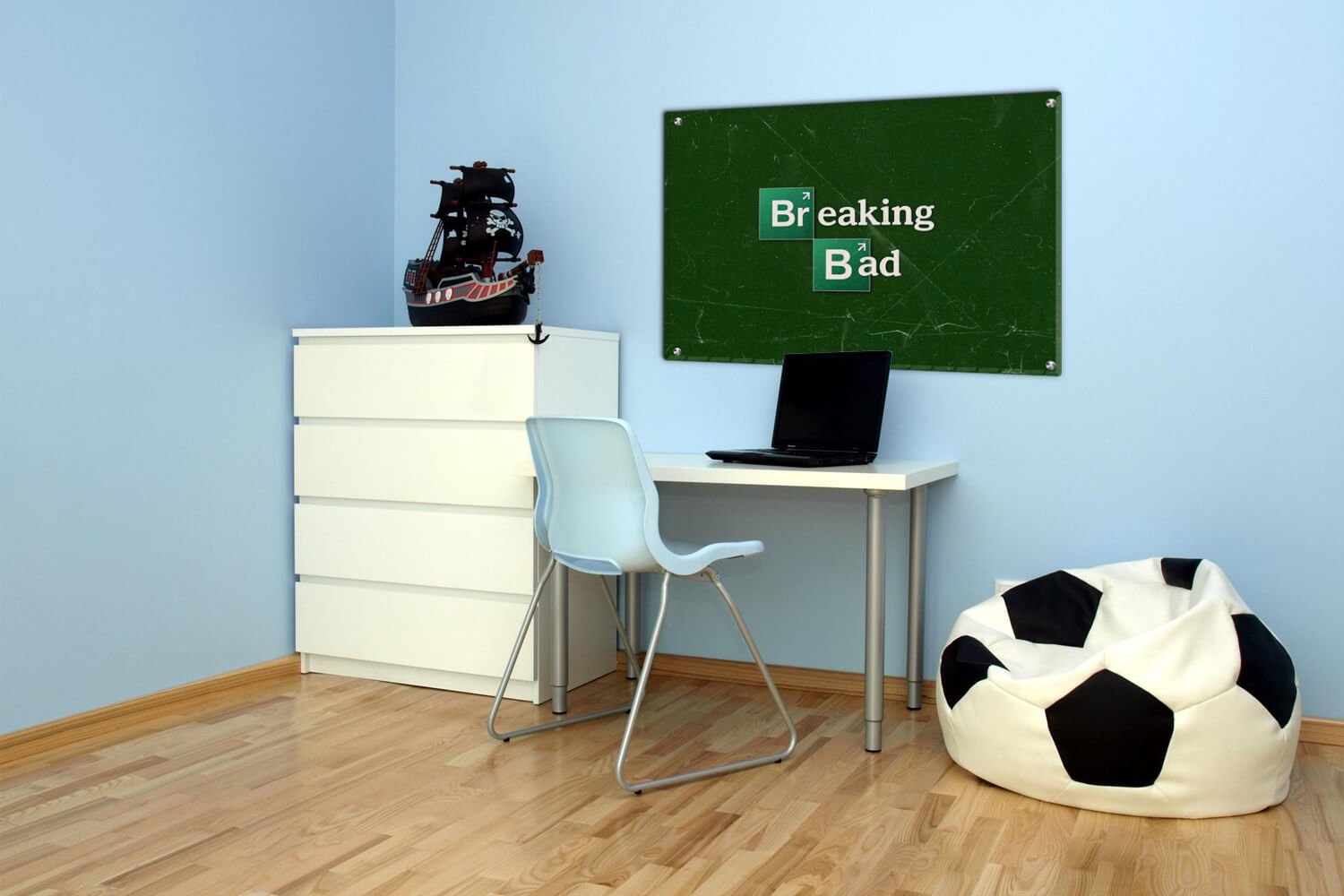תמונת זכוכית בעיצוב מודרני ומלא השראה, המשלבת את האלמנטים המוכרים מהסדרה האייקונית "Breaking Bad". הרקע הוא בגוון ירוק כהה עם מרקם מעודן ומעט "משומש", המוסיף מראה ייחודי ואלגנטי. במרכז התמונה מופיעות שתי צורות מרובעות בסגנון נוסחאות כימיות, המכילות את המילים "Breaking" ו-"Bad" בגופן מודגש וצבע קרם בהיר, המודפס במרכז כל צורה.מושלם לעיצוב חדרי מגורים, משרדים או אזורי בילוי, ומעניק לחלל מראה אלגנטי ומסתורי עם קריצה לעולם הכימיה והסדרה האייקונית.